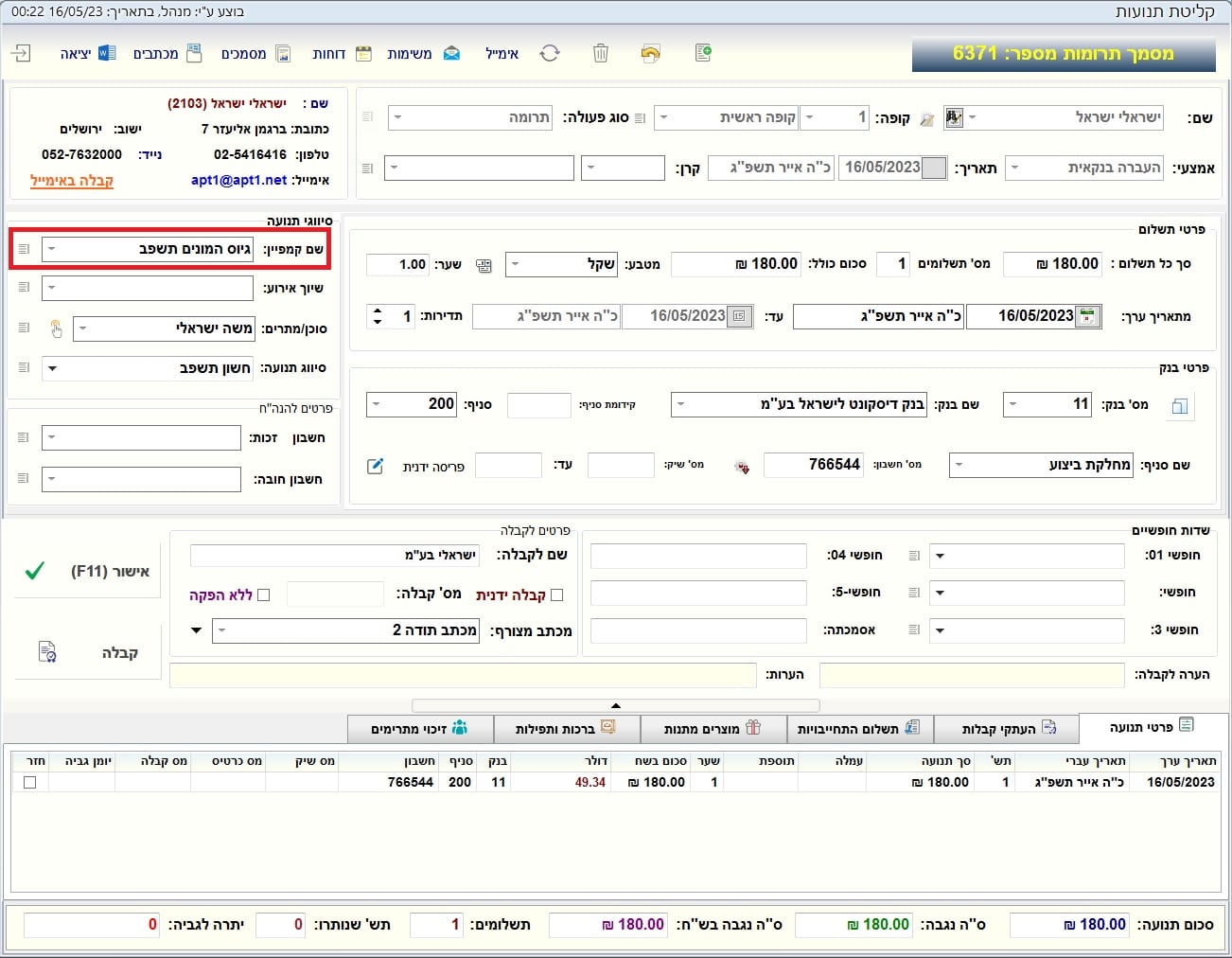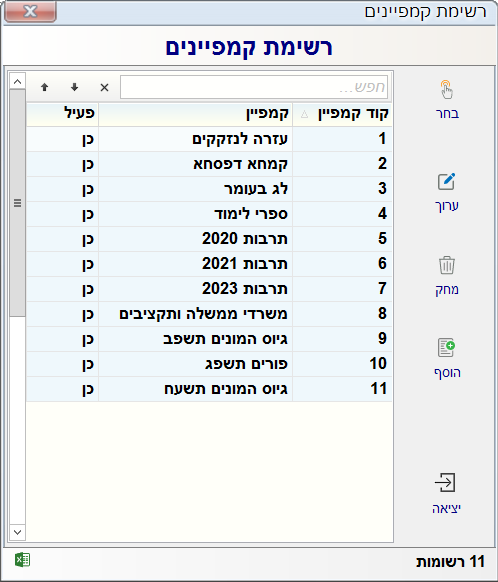 ניתן לשייך קמפיין לכל סוגי התנועות (תרומות, הכנסות, הלוואות, פקדונות, שכר לימוד, מלגות וספקים, תשלומי חשבוניות ולקוחות)