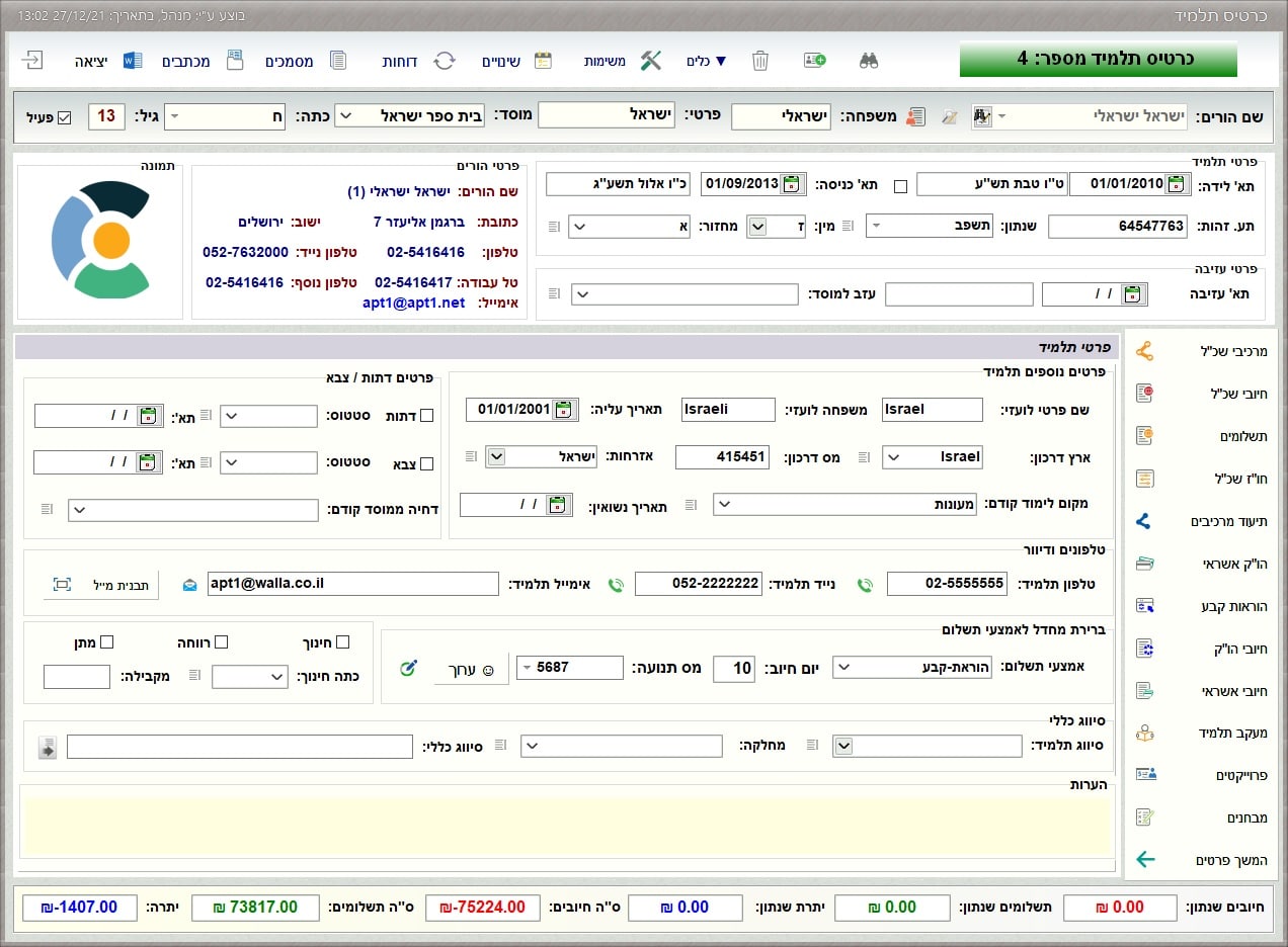 בכרטיס התלמיד מופיעים כל הפרטים האישיים של התלמיד, כמו"כ נתוני שכר הלימוד ויתרות, משימות, מסמכים מקושרים, מעקב תלמיד ומבחנים.